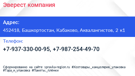 Эверест, компания по адресу 452418, Башкортостан, Кабаково, Аквалангистов, 2 к1 в дальнейшем Организация, размещена в следующих категориях: