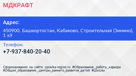 МДКРАФТ по адресу 450900, Башкортостан, Кабаково, Строительная (Зинино), 1 к9 в дальнейшем Организация, размещена в следующих категориях: