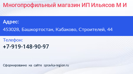 Многопрофильный магазин, ИП Ильясов М.И. по адресу 453028, Башкортостан, Кабаково, Строителей, 44 в дальнейшем Организация, размещена в следующих категориях: