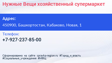 Нужные Вещи, хозяйственный супермаркет по адресу 450900, Башкортостан, Кабаково, Новая, 1 в дальнейшем Организация, размещена в следующих категориях: