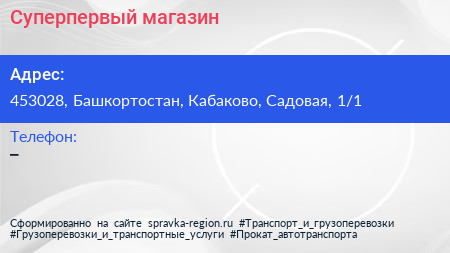 Суперпервый, магазин по адресу 453028, Башкортостан, Кабаково, Садовая, 1/1 в дальнейшем Организация, размещена в следующих категориях: