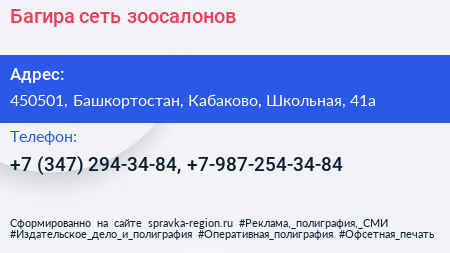 Багира, сеть зоосалонов по адресу 450501, Башкортостан, Кабаково, Школьная, 41а в дальнейшем Организация, размещена в следующих категориях: