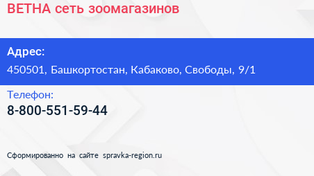 ВЕТНА, сеть зоомагазинов по адресу 450501, Башкортостан, Кабаково, Свободы, 9/1 в дальнейшем Организация, размещена в следующих категориях: