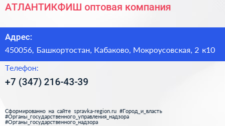 АТЛАНТИКФИШ, оптовая компания по адресу 450056, Башкортостан, Кабаково, Мокроусовская, 2 к10 в дальнейшем Организация, размещена в следующих категориях: