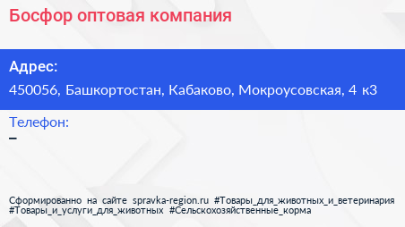 Босфор, оптовая компания по адресу 450056, Башкортостан, Кабаково, Мокроусовская, 4 к3 в дальнейшем Организация, размещена в следующих категориях: