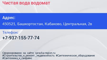 Чистая вода, водомат по адресу 450521, Башкортостан, Кабаково, Центральная, 2в в дальнейшем Организация, размещена в следующих категориях: