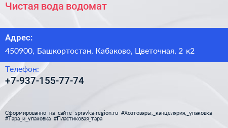 Чистая вода, водомат по адресу 450900, Башкортостан, Кабаково, Цветочная, 2 к2 в дальнейшем Организация, размещена в следующих категориях: