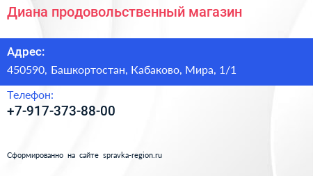 Диана, продовольственный магазин по адресу 450590, Башкортостан, Кабаково, Мира, 1/1 в дальнейшем Организация, размещена в следующих категориях: