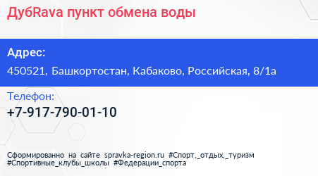 ДубRava, пункт обмена воды по адресу 450521, Башкортостан, Кабаково, Российская, 8/1а в дальнейшем Организация, размещена в следующих категориях: