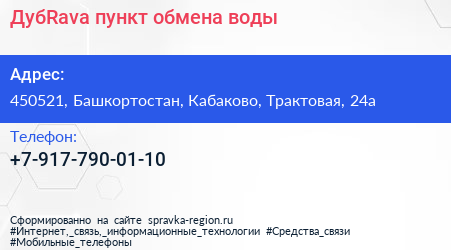 ДубRava, пункт обмена воды по адресу 450521, Башкортостан, Кабаково, Трактовая, 24а в дальнейшем Организация, размещена в следующих категориях: