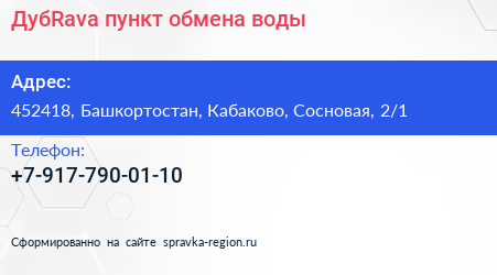 ДубRava, пункт обмена воды по адресу 452418, Башкортостан, Кабаково, Сосновая, 2/1 в дальнейшем Организация, размещена в следующих категориях: