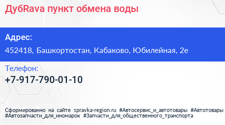 ДубRava, пункт обмена воды по адресу 452418, Башкортостан, Кабаково, Юбилейная, 2е в дальнейшем Организация, размещена в следующих категориях: