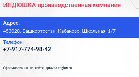 ИНДЮШКА, производственная компания по адресу 453028, Башкортостан, Кабаково, Школьная, 1/7 в дальнейшем Организация, размещена в следующих категориях:
