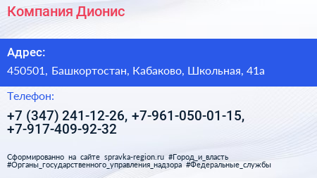 Компания Дионис по адресу 450501, Башкортостан, Кабаково, Школьная, 41а в дальнейшем Организация, размещена в следующих категориях: