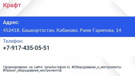 Крафт по адресу 452418, Башкортостан, Кабаково, Рами Гарипова, 14 в дальнейшем Организация, размещена в следующих категориях: