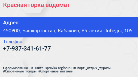 Красная горка, водомат по адресу 450900, Башкортостан, Кабаково, 65-летия Победы, 105 в дальнейшем Организация, размещена в следующих категориях: