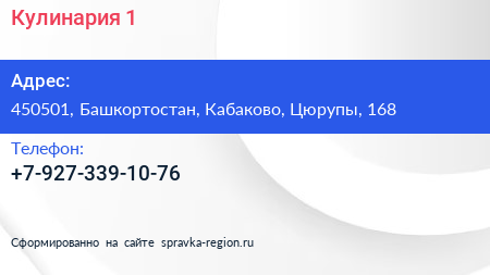 Кулинария №1 по адресу 450501, Башкортостан, Кабаково, Цюрупы, 168 в дальнейшем Организация, размещена в следующих категориях: