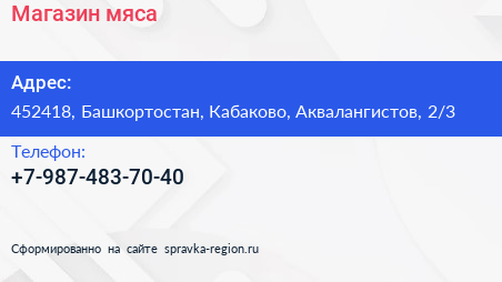 Магазин мяса по адресу 452418, Башкортостан, Кабаково, Аквалангистов, 2/3 в дальнейшем Организация, размещена в следующих категориях: