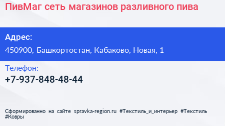 ПивМаг, сеть магазинов разливного пива по адресу 450900, Башкортостан, Кабаково, Новая, 1 в дальнейшем Организация, размещена в следующих категориях: