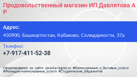 Продовольственный магазин, ИП Давлятова А.Р. по адресу 450900, Башкортостан, Кабаково, Солидарности, 37а в дальнейшем Организация, размещена в следующих категориях: