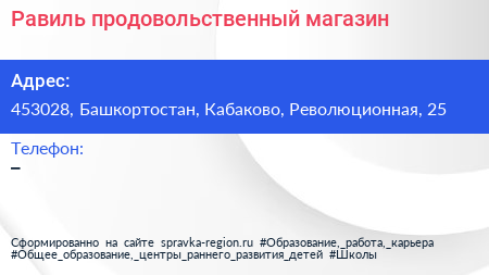 Равиль, продовольственный магазин по адресу 453028, Башкортостан, Кабаково, Революционная, 25 в дальнейшем Организация, размещена в следующих категориях:
