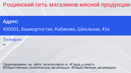 Рощинский, сеть магазинов мясной продукции по адресу 450501, Башкортостан, Кабаково, Школьная, 41а в дальнейшем Организация, размещена в следующих категориях: