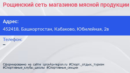 Рощинский, сеть магазинов мясной продукции по адресу 452418, Башкортостан, Кабаково, Юбилейная, 2в в дальнейшем Организация, размещена в следующих категориях: