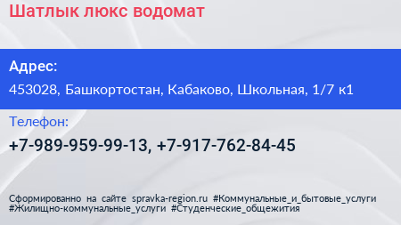 Шатлык-люкс, водомат по адресу 453028, Башкортостан, Кабаково, Школьная, 1/7 к1 в дальнейшем Организация, размещена в следующих категориях: