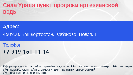 Сила Урала, пункт продажи артезианской воды по адресу 450900, Башкортостан, Кабаково, Новая, 1 в дальнейшем Организация, размещена в следующих категориях:
