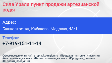 Сила Урала, пункт продажи артезианской воды по адресу Башкортостан, Кабаково, Медовая, 43/1 в дальнейшем Организация, размещена в следующих категориях: