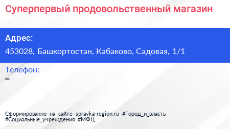 Суперпервый, продовольственный магазин по адресу 453028, Башкортостан, Кабаково, Садовая, 1/1 в дальнейшем Организация, размещена в следующих категориях:
