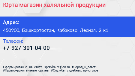 Юрта, магазин халяльной продукции по адресу 450900, Башкортостан, Кабаково, Лесная, 2 к1 в дальнейшем Организация, размещена в следующих категориях: