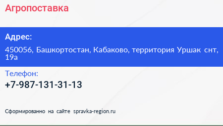 Агропоставка по адресу 450056, Башкортостан, Кабаково, территория Уршак снт, 19а в дальнейшем Организация, размещена в следующих категориях: