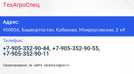 ТехАгроСпец по адресу 450056, Башкортостан, Кабаково, Мокроусовская, 2 к9 в дальнейшем Организация, размещена в следующих категориях: