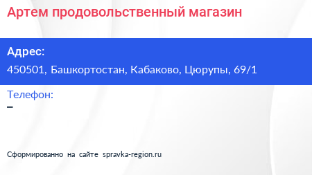 Артем, продовольственный магазин по адресу 450501, Башкортостан, Кабаково, Цюрупы, 69/1 в дальнейшем Организация, размещена в следующих категориях: