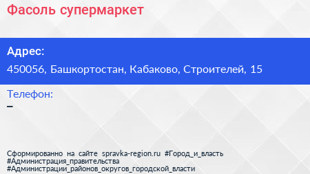 Фасоль, супермаркет по адресу 450056, Башкортостан, Кабаково, Строителей, 15 в дальнейшем Организация, размещена в следующих категориях: