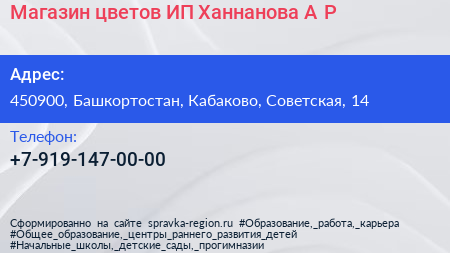 Магазин цветов, ИП Ханнанова А.Р. по адресу 450900, Башкортостан, Кабаково, Советская, 14 в дальнейшем Организация, размещена в следующих категориях: