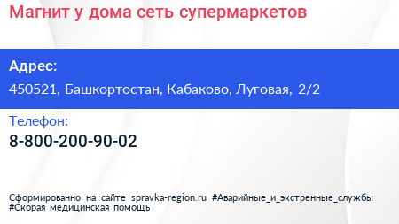 Магнит у дома, сеть супермаркетов по адресу 450521, Башкортостан, Кабаково, Луговая, 2/2 в дальнейшем Организация, размещена в следующих категориях: