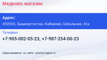 Медковъ, магазин по адресу 450501, Башкортостан, Кабаково, Школьная, 41а в дальнейшем Организация, размещена в следующих категориях: