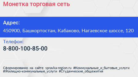 Монетка, торговая сеть по адресу 450900, Башкортостан, Кабаково, Нагаевское шоссе, 120 в дальнейшем Организация, размещена в следующих категориях: