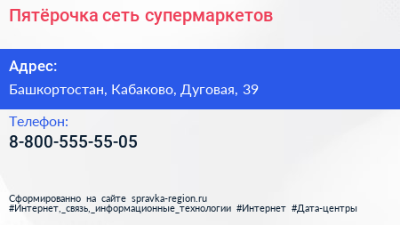 Пятёрочка, сеть супермаркетов по адресу Башкортостан, Кабаково, Дуговая, 39 в дальнейшем Организация, размещена в следующих категориях: