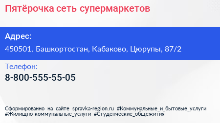 Пятёрочка, сеть супермаркетов по адресу 450501, Башкортостан, Кабаково, Цюрупы, 87/2 в дальнейшем Организация, размещена в следующих категориях:
