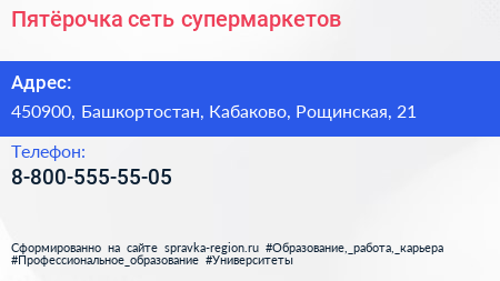 Пятёрочка, сеть супермаркетов по адресу 450900, Башкортостан, Кабаково, Рощинская, 21 в дальнейшем Организация, размещена в следующих категориях:
