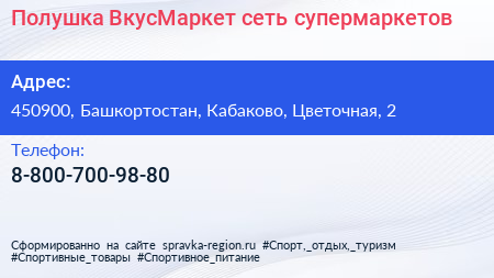 Полушка ВкусМаркет, сеть супермаркетов по адресу 450900, Башкортостан, Кабаково, Цветочная, 2 в дальнейшем Организация, размещена в следующих категориях: