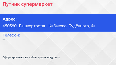 Путник, супермаркет по адресу 450590, Башкортостан, Кабаково, Будённого, 4а в дальнейшем Организация, размещена в следующих категориях:
