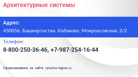 Архитектурные системы по адресу 450056, Башкортостан, Кабаково, Мокроусовская, 2/2 в дальнейшем Организация, размещена в следующих категориях: