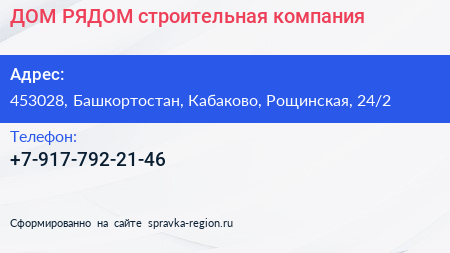ДОМ РЯДОМ, строительная компания по адресу 453028, Башкортостан, Кабаково, Рощинская, 24/2 в дальнейшем Организация, размещена в следующих категориях: