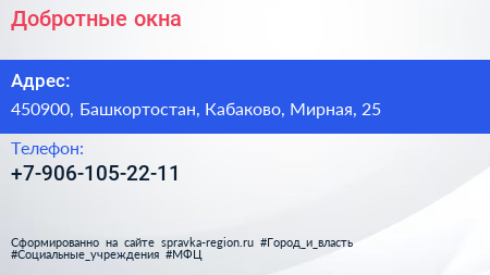 Добротные окна по адресу 450900, Башкортостан, Кабаково, Мирная, 25 в дальнейшем Организация, размещена в следующих категориях:
