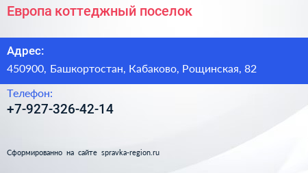 Европа, коттеджный поселок по адресу 450900, Башкортостан, Кабаково, Рощинская, 82 в дальнейшем Организация, размещена в следующих категориях:
