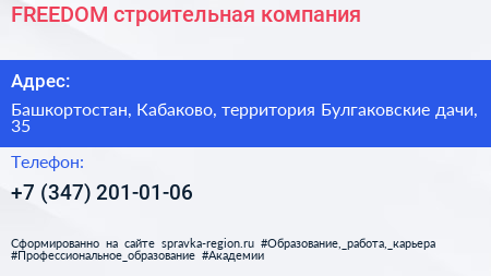 FREEDOM, строительная компания по адресу Башкортостан, Кабаково, территория Булгаковские дачи, 35 в дальнейшем Организация, размещена в следующих категориях: